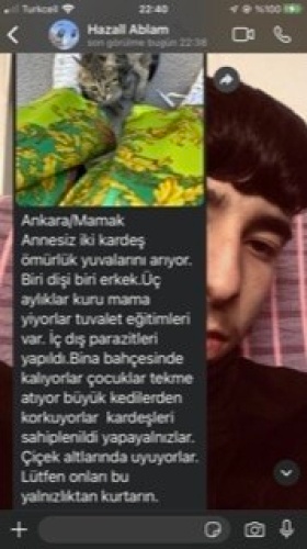 Ankara/Mamak Annesiz iki kardeş ömürlük yuvalarını arıyor. Biri dişi biri erkek.Üç aylıklar kuru mama yiyorlar tuvalet eğitimleri var. İç dış parazitleri yapıldı.Bina bahçesinde kalıyorlar çocuklar tekme atıyor büyük kedilerden korkuyorlar kardeşleri sahiplenildi yapayalnızlar. Çiçek altlarında uyuyorlar. Lütfen onları bu yalnızlıktan kurtarın.