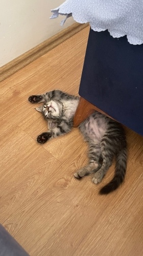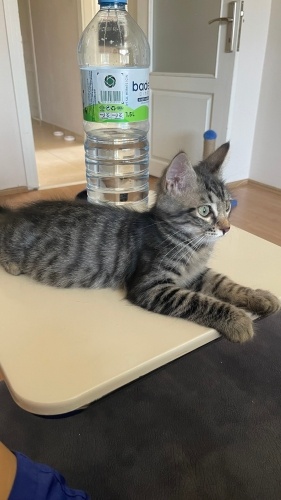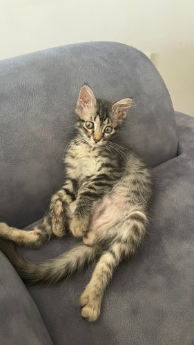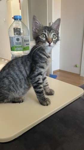 Yaklaşık 1-2 aylıkken sokakta gözleri enfeksiyonlu bir şekilde buldum. Göz tedavisi ve soğuk algınlığı tedavisi için bir süre evime aldım tedavisini yaptım şu anda sağlıklı. 2 aydır benimle, aşıları tam. Şu an 3-4 aylık erkek tekir. Kum eğitimi var, kuru/yaş mama yiyor. Hiçbir beslenme ve sağlık sorunu yok. Ben hasta olduğu ve sokakta yaşayamayacak kadar küçük olduğu için evime almıştım, uzun süreli bakabilecek maddi durumda olmadığım için sahiplendiriyorum. Mükemmel uyumlu ve çabuk öğrenen, eğitilmeye açık bir kedi, insan canlısı. Yeni ailesine tuvaleti, tırmalama tahtası ve oyuncakları ile birlikte gidecek.