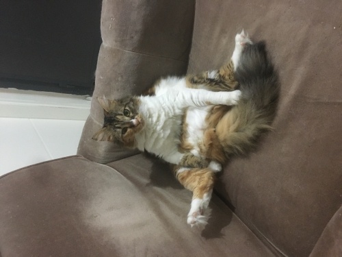 İzmir bucada 2 yıldır bana ve ilk kedim momoya arkadaşlık etmektedir. 6 aylıkken kısırlaştırıldı, ilk iç dış parazit haricinde aşısı yok ama hiç hasta olmadı. İnsanlarla arası mükemmel diğer kediler ile arası 2 gün içerisinde mükemmele yaklaşabilir. Tüy yapısı olaraka norwegian forest a benziyor. 3 renkli sokak kedisi bakıma ihtiyacı olduğu için sahiplendim, fakat bakımı konusunda zorlanmaktayım.