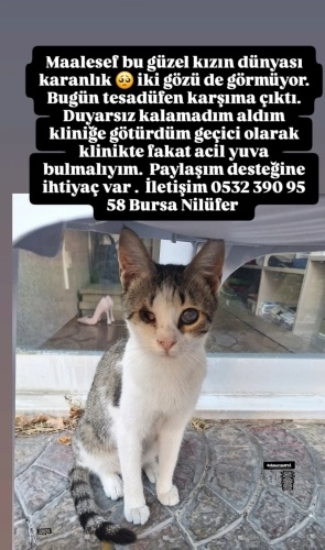 Yaklaşık 3-4 aylık. Bu güzel kızın iki gözü de klinikte kontrol edildi ve görmüyor. Muhtemelen evden atıldı çünkü insan canlısı, sevgi dolu mırıl mırıl. Her işini kendi görüyor, ev uyumlu. Klinikte iç ve dış uygulamaları yapıldı. Işıl ışıl minik kızımız. LUTFEN GÜZEL KALPLİ MELEK ONA BİR ŞANS VER‼️ÖMÜRLÜK IŞIĞI EN OL🙏🏻✨️ İLETİŞİM TEL:0532 390 95 58 Burçin hn