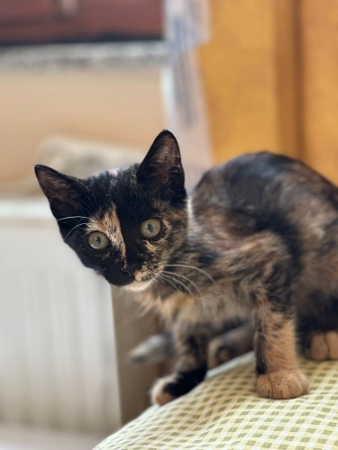 Dışarda araba motorunda bulduk. Eve aldık geçici yuva olarak. Evde Şen şakrak oyuncu bir kedi. Ama dışarda herşeyden çok korkuyor bu sebeple dışarda yaşayamaz. Ömürlük yuvasını arıyoruz