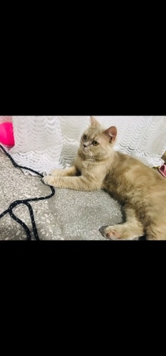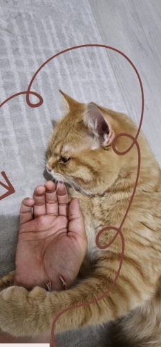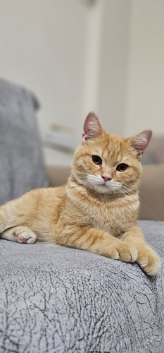 Kehribar gözlü, sarı beyaz renkli. British ve Tekir kırması bir kedidir.