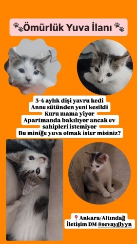 3-4 aylık yavru dişi kedi. anne süründen yeni kesildi. Kuru mama yiyor. Apartmanda bakılıyor ancak ev sahipleri istemiyor. Bu miniğe yuva olmak istermisiniz Ankara/Altındağ