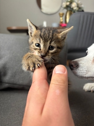 Sokakta bulduğum bu minik tekir kızımızın iç ve dış parazit aşıları yapıldı, sağlık durumu çok iyi. Tuvalet eğitimi var. 🐾 Çok oyuncu, sevecen ve insan canlısı bir yavru. Henüz minicik, sevgi dolu bir aileye ihtiyacı var.