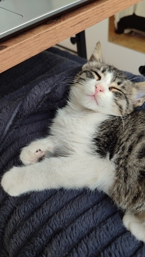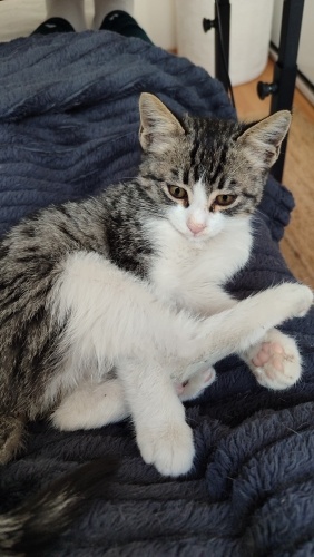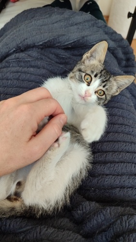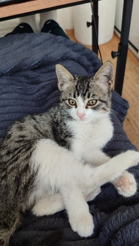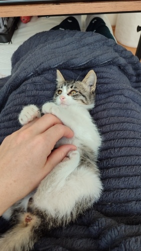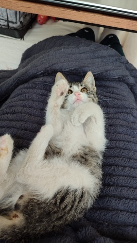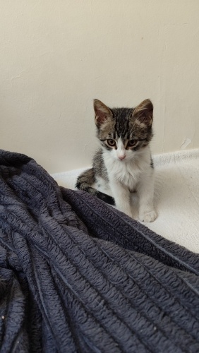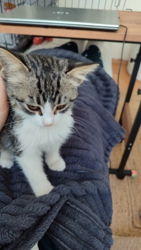 1,5 aylık, dişi,kum kullanıyor, kuru mama yiyor.İnanılmaz sevimli bir tip💜İnsan görünce gurlamaya başlar,hemen göbeğini açar...Aşırı temas bağımlısı,siz öpünce resmen mest olan, kucakta uyumayı çok seven minnoş. Uyumluda, benim kedilerime hemen uyum sağladı.