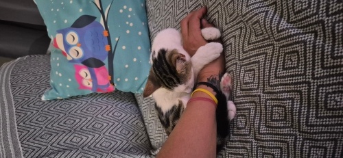 Aşıları yapıldı, çip takılı, sağlıklı sadece kuyruğu kırıktı iyileşti. Bir gözü mavi bir gözü yeşil