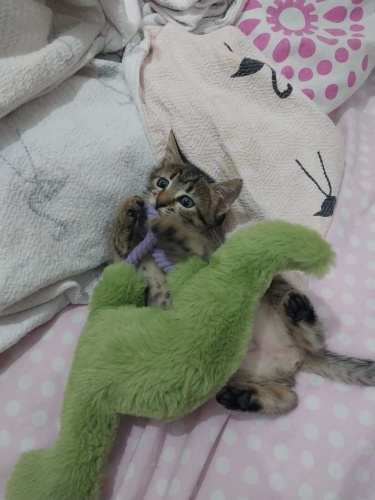 Bahçede ağlarken bulduk vitamin takviyileriyle toparlandı ve sağlıklı bir yavruya dönüştü. Enerjik ,oyuncu her insana ve kediye yanasıyor.ic dış parazitleri yapıldı.