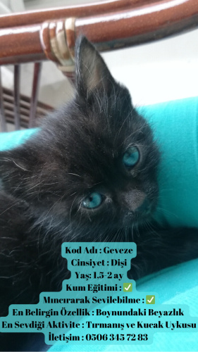 Gemlik/Bursa'da yaşıyorum. Anne kedi apartmanımızın bodrumuna yavrulamıştı ancak ne yazık ki dikkatsiz sürücüler tarafından ezildi. Cadde üstünde yaşıyoruz ve bu yavruları aynı kadere mahkum etmek istemiyorum. Geveze, adını ilk tanıştığımız dönem en çok sesi çıkaran olmasından aldı; artık pek geveze sayılmaz. Çoğunlukla siyah, boyun kısmında Belirgin beyazlık var. Kardeşleriyle koşturup boğuşmayı ve yemek yemeyi çok sever. Oyun ve yemek sonrası tüm kardeşleri gibi o da kucağa tırmanıp huzurla uyumaya bayılır. İç-dış parazitleri yapıldı. Kısırlaştırma ve takip (özellikle başlangıç aşamasında oldukça sık bir şekilde) şartım var.