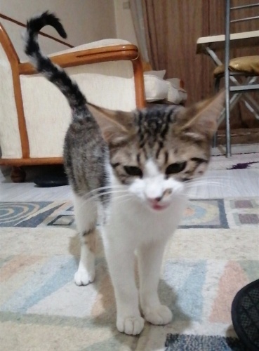 Dışkapıda gece saatlerinde etrafında köpekler çevriliyken fıskiyenin başında su içmeye çalışırken bulduk. Tekrar sokağa dönmek için çok küçük, büyük ihtimalle annesi terk etti, çünkü o parkta ilk defa kedi gördük, genelde hep köpekler cirit atar. İç dış paraziti yapıldı. Çok sevecen, sürekli yanınızda dolaşır, iki okşamaya hemen pancar motoru gibi mırlamaya başlar. Birazcık severseniz büyük ihtimalle sizi annesi sanabilir. Evde 2 kedim var ve kedilerimden birisi asla anlaşamadığı için sahiplendirmek istiyorum. Umarım güzel bir yuvası olur.