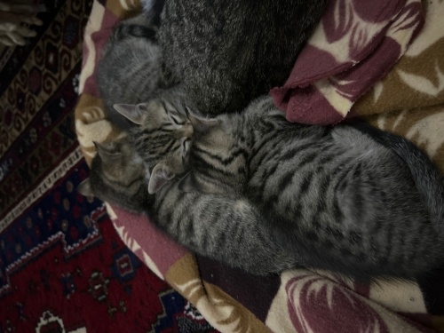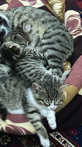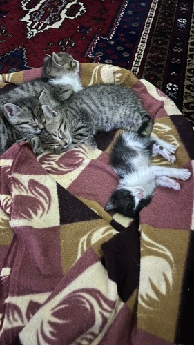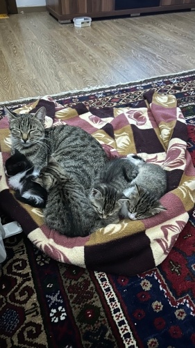 Annelerini bulduğumda hastaydı ölmek üzere idi. Eve alıp veteriner tavsiyesi ile bakımını yaptım. İyileşti ama sürpriz hamileymiş. Yeniden sokağa bırakamadım. 14 eylüde dört güzel mi güzel bebek dünyaya geldi. Bu canlar 15 kasımda iki aylık olacaklar . Bebeklere sıcak ve ömürlük yuva arıyorum. İki dişi iki erkek. Çok akıllılar 40 günlük oldular. Tuvalet eğitimi hiç sorun olmadı.üç tekir bir tanesi smokin. 😻😻😻😻