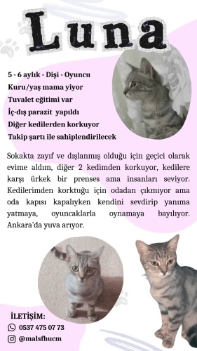 Luna gri-beyaz renklerinde (British-Tekir kırması olma ihtimali yüksek), tahminimce 5 aylık civarı, kendini sevdirmeye bayılan, insanlara kolayca alışabilen, oyuncu bir hanımefendi. Sokakta zayıf ve dışlanmış olduğu için geçici olarak evime aldım, diğer 2 kedimden korkuyor, kedilere karşı ürkek bir prenses ama insanları seviyor. İç-dış parazit için hap ve ense damlası uygulaması yapıldı, çipi yok. Kedilerimden korktuğu için odadan çıkmıyor lakin oda kapısı kapalıyken kendini sevdirip yanıma yatmaya, oyuncaklarla oynamaya bayılıyor. Kuru-yaş mama yiyor, kum eğitimi var. İyi olduğunu görebilmek adına takip şartı ile sahiplendirmek istiyorum.