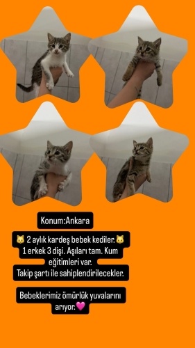 İki aylık dört tane dünya güzeli bebeğe yuva arıyoruz. Biri erkek üçü dişi. Kum eğitimleri mevcut. Kuru ve yaş mama yiyorlar. Onların sorumluluğunu alıp ömürlük yuva olabilecek kişilere sahiplendirilecektir. Konum:Ankara İletişim: 0539 609 10 99 Whatsapptan yazabilirsiniz 🌼
