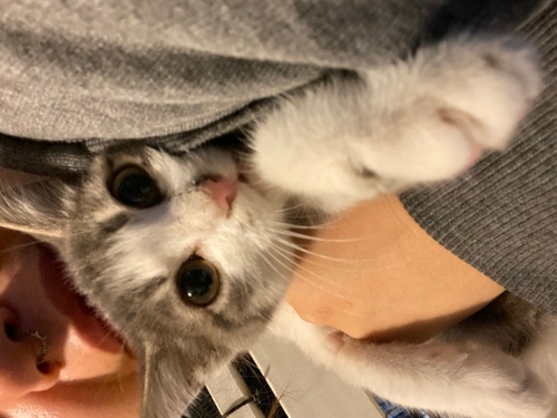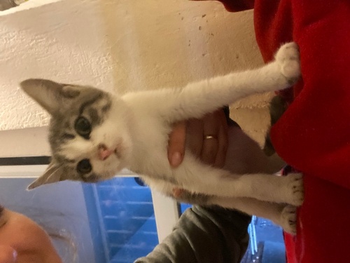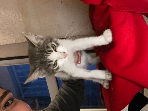 Evimin balkonuna bırakılmış. Kolunda hala serum izi var. Veterinere götürdüm sağlıklı 2 aylık güzel bir kız çocuğu. İç dış parazitini yaptırdım. Evimde 5 tane hayvanım olduğu için eve alamıyorum malesef :( balkonumda bakıyorum ama balkona gelen diğer büyük kedilerden dayak yiyor. Çok uysal, kucakta uyumaya bayılıyor. Sadece biraz fazla konuşuyor :)
