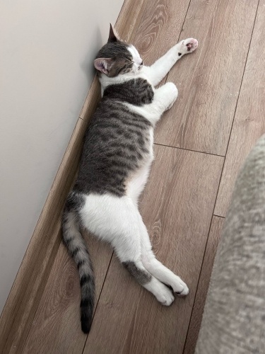 3 aylıkken soğukta bulundu ve geçici yuva olduk. Hali hazırda 2 kedim var ve yeni doğan bebeğim olduğu için artık ayrılma vakti geldi. Oyuncu,kendini sürekli sevdiren uyumlu kedi