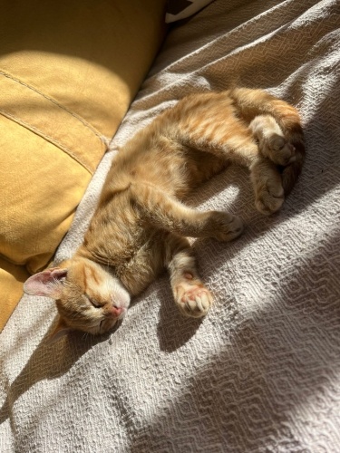 Erkek bir sarman. Henüz kısırlaştırma yaşı gelmediğinden kısır değil. İç dış parazit aşıları yapıldı. 2-3 aylık olduğu tahmin ediliyor. Aşırı uysal,sizinle aynı koltukta oturur sizinle uyur,oynar. Tırmalama ve tırmanma huyu yok. Sokakta yapamaz,bence kaçırmayın bu sarı fırtınayı.