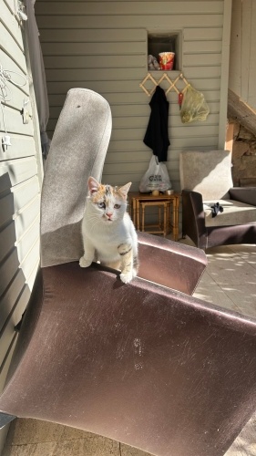 Geçici evinin bahçesinde. Bir gözü siyam mavi bir gözü sarman sarı kırık kuyruk. Yaklaşık dört aylık. İlginç bir kedi
