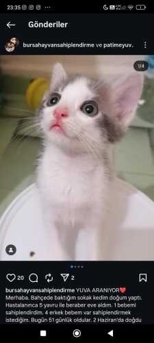 02 Haziran doğumlu bir kız çocuğu. Sağlıklı, kuru mama yiyor, kum alışkanlığı var. Sevgi pıtırcığı, sürekli sevilmek ve kucak istiyor. Mutlu bir yuvaya ihtiyacı var.