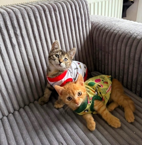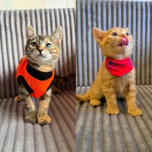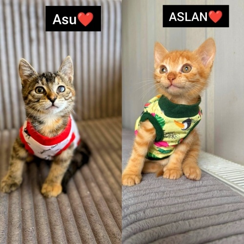 Asu ve Aslan, 1.5 aylık iki kardeş.Mama yiyor,kum kullanıyorlar.İç-dış parazit uygulamaları ve veteriner kontrolleri tam.