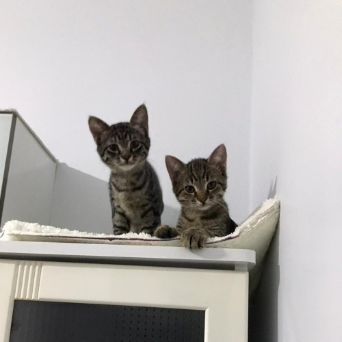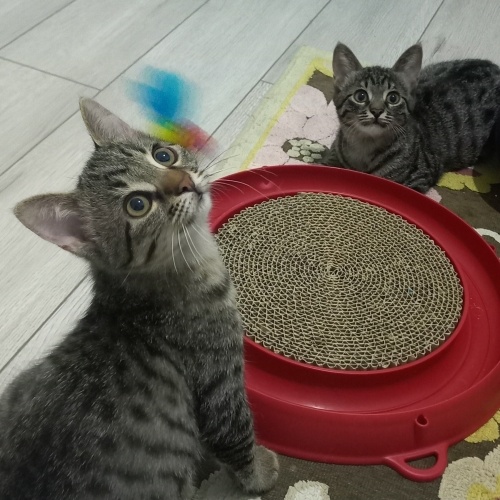 Sitemizde doğan annelerinin reddettiği biri dişi biri erkek kardeşleri fare kadarken ölmek üzereyken eve aldık, biberonla besledik ve kısa sürede toparlandılar. Şu an çok sağlıklılar. Oyuncular yaşlarından dolayı tabi, sürekli birlikte oynuyorlar ama tekir kediye göre uysallar, kendilerini sevdiriyorlar hemen mırlamaya başlıyorlar. Tuvalet eğitimleri var. Kuru ve yaş mama yiyolar.