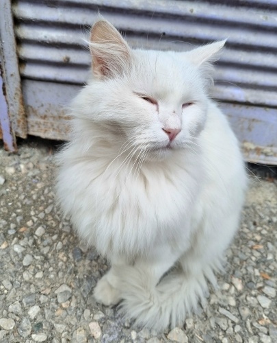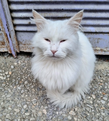 Sahibi bırakmış, gelen geçen herkesin peşine takılıyor ve soğukta yapamıyor. Biraz bakılırsa dünyanın en güzel kedisi olur, sadece biraz sevgi gerekiyor. Büyük ihtimalle dişi fakat kabarık tüylerinden dolayı cinsiyetinden %100 emin olamadım, güncelleyeceğim. (Gözlerinde bir sorun yok sadece dışarda çok yorgun düştüğü için uykulu ve üzgün.)