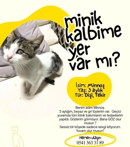 Mini mini bir can tanesi. Geçici yuvasında bütün klinik bakımları , iç ve dış parazit uygulamaları yaptırıldı. Yaklaşık 2.5-3 ay civarı. Kum eğitimi var. Ev terbiyeli. Kuru mama yiyor. İnsanla olmayı seviyor. Gözleri dışında sağlığı yerinde. Onu sefkatinle sarmalayıp bir ömür güvende tutacak pamuk kalpli annesi sen olur musun? İletişim tel:5413633189 KANUNLAR GEREĞİ ÇİP VE TAKİP ŞARTI VARDIR❗️