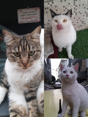 Beyaz ve tekir olanlar erkek, siyah kulaklı dişi. Üçü de sokakta yaşıyor ancak insanlarla çok samimi ilişkileri var, sevgi için sürekli yol kestikleri biliniyor. Belki şans vermek istersiniz