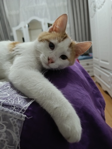 Beyaz ve sarı bir kedi. Sokaktan buldum. İlk bulduğumda iki gözü görmüyordu. Tedavi ettim. Bir gözü açıldı. Diğer gözünde hala sorun var. Evde 3 kedim var bu sebeple yuva arıyorum. Dışarda yapabilir mi diye denedim. Arabalardan kaçmıyor. Onun sevgi dolu yuvası olur musunuz? Çok sakin bir kedi. Tuvalet eğitimi varm