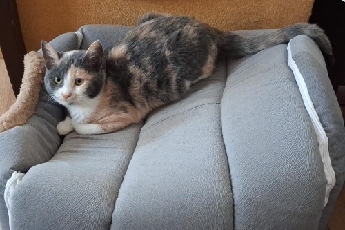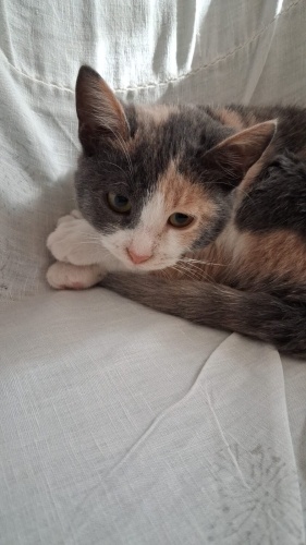 3 aylik calico (patiska) cinsi denilen 3 renkli tatli bir minnaktir. Agir yarali bir sekilde yol ortasinda bulunmus tefavi baslanip suan iyi durumda ve gecici bir evde bakilmaktadir. Cana yakindir ama biraz ürkekliği vardir. (Her ne yasadiysa artik..:( ..Sokaklarda yaşamasın istiyoruz maddi manevi cok emek verildi 3. ayina kadar. Bundan sonrasında kendi yuvası olsun omurluk bakilsin tlf dan ulasabilirsiniz🙏