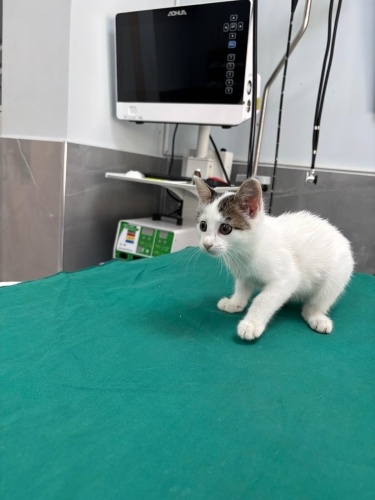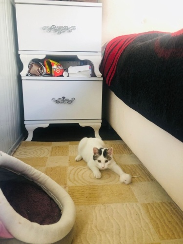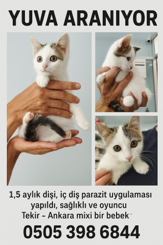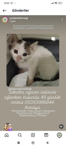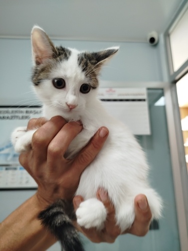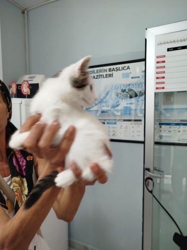 Pamuk 1 ay kadar once agacta ağlarken bulundu. Annesiz cok küçük yaralı bir kediydi. 3 hafta veterinerde kaldı.ic dış parazit tedavisi ilk karma aşısı yapıldı. Kar gibi beyaz tuylerini sadece basindaki ve kuyrugundaki renkle özellikli kılmış yaradan. Belliki Ankara tekir mixi. Cok uyumlu oyuncu bir kedi tuvalet terbiyesi var.su an gecici bir evde bakılıyor.Kaldigi evde hayvan nüfusu cok fazla ona yuvasini acacak bir melek bulunur belki.size can yoldaşı olur.Durum acil