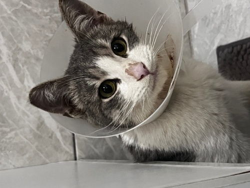 Sokakta beslediğim yavru kedimin yanağı yediği keskin bir şeyden dolayı kesilmiş ve iltihaplanarak enfeksiyon kapmış. Yanağı nerdeyse tamamen erimiş haldeydi. Veterinere götürüp tedavisini yaptırdım ve iyileşme sürecinde. Çok cana yakın ve uysal bir kedi. Tekrar dışarıya bırakmak zorunda kalmak istemiyorum.