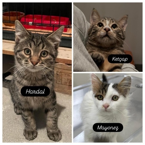 Üçüzler; olağanüstü güzel, biri pofuduk tekir oğlanlar, 3,5-4 aylık civarı sağlıklı bebekler. Kum eğitimleri var. Kuru ve yaş mama yiyorlar. İç-dış parazit uygulamaları var. Çok oyuncular, uzun uzun oyun oynuyorlar. İnanılmaz masum ve çok sevecenler. İnsanlar ve diğer kediler ile araları gayet iyi.