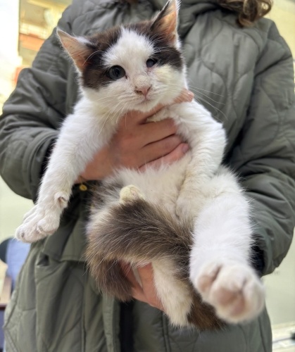 2-3 ay civarında erkek. Çok güzel pofuduk bir çocuk. Tüyleri beyaz ve nadir kahverengi. Bir gözü görmüyor. Dışarıda hasta olduğu için şu an veterinerde tedavi görüyor 2-3 gün sonra taburcu olacak. Parazit ilaçları yapıldı. İstanbul içi nakil desteği sağlarız.