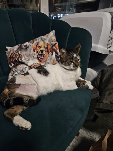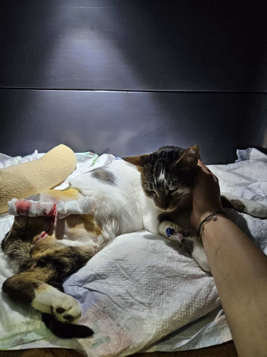 Bu bebiş femur kırığıyla geldi geldi kliniğe 2 çok yıpratıcı operasyon oldu enfeksiyonu kurutmak için çok ağır antibiyotikler kullanıldı. Enfeksiyon kurudu ama bacağı maalesef kurtaramadık amputasyon yapıldı. Sokak çocuğu olduğu için diğer kedilerle anlaşabiliyor. Aşırı sevecen ve ağır başlı bir kedi. Maalesef bi tık ön yargılı bazen malum çok travma yaşadı🥺Göztepe köprüsünün üstünde bulunmuş ve tekrar oraya dönecek ama orada yaşaması çok zor. 4 aydır klinikte tedavi görüyor. Son 1 aydır da sadece yuvasını bekliyor
