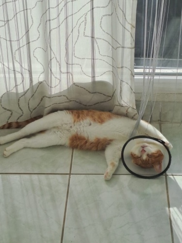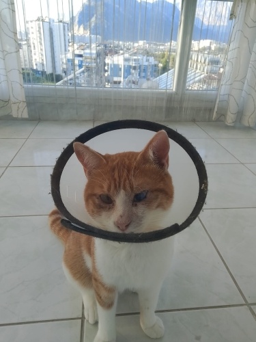 O, inanılmaz bir ruh gücü gösterdi ve başarılı bir ameliyat geçirdi! Gözü kurtarıldı. Şimdi, kahramanımız iki haftalık önemli bir rehabilitasyon sürecinde. Fotoğraflarda görüldüğü gibi, uslu uslu "koruyucu yaka"sını takıyor ve mutlu yuvasını bekliyor!