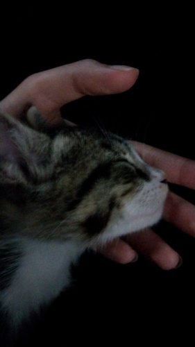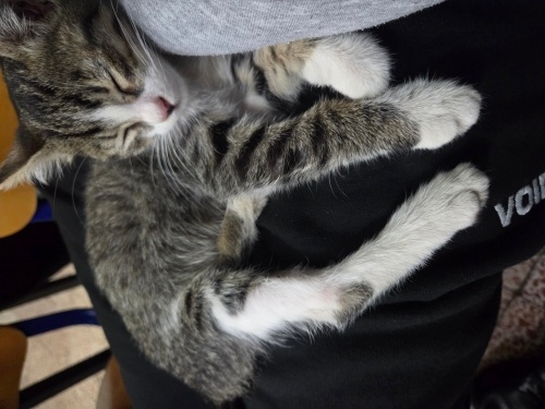 Okulda bulduğumuz küçücük bir yavru kedi. Annesi yok, tek başına, cok uysal, sevgi dolu, kucakta yatmayı seviyor. Kokmuyor, tüy dökmüyor, mırıl mırıl