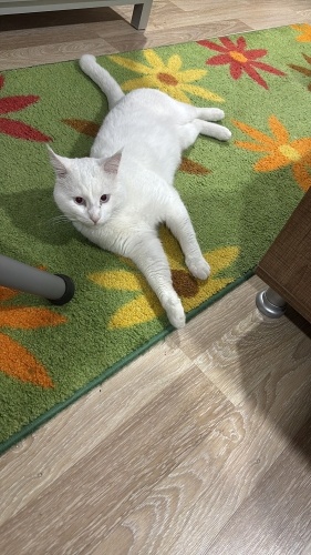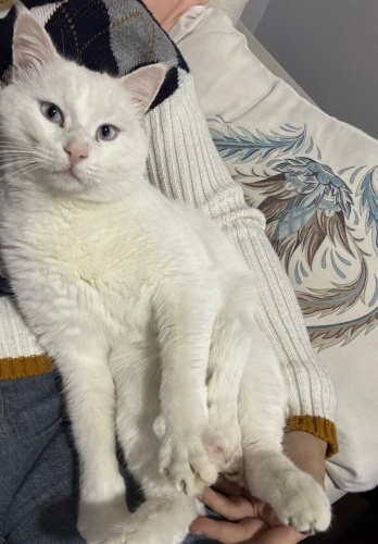 British cinsi beyaz kısır erkek kedi. Her iki kulağıda sağır. Sokakta bırakıldı terkedilmiş ya da kaçmış. Çipi yok. Bulunduğunda kısırlaştırıldı ve karma aşısı yaptırıldı. Şu an geçici yuvada fakat zamanı kısıtlı. Tam bir kucak delisi. Duymaması onu daha az kedi yapmıyor. Mırıl mırıl bir hayvan. Duymadığı için biraz yüksek sesle miyavlayabiliyor. Ortama alıştığında miyavlaması daha da azalacaktır. Başka bir kedi ile yaşamaya uygun olup olmadığını bilmiyorum ama tam bir insan sevdalısı. Sağır kedi bakımından anlayan ve onunla yaşama sorumluluğunu alacak kişiler tarafımıza ulaşabilir