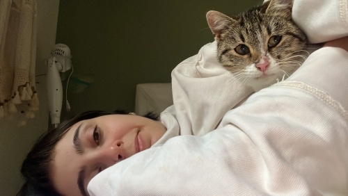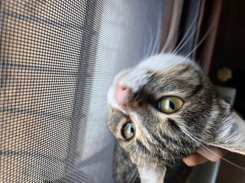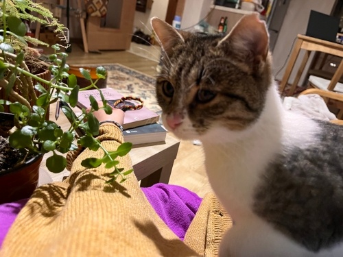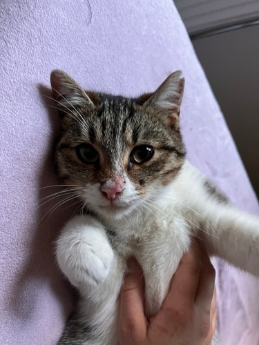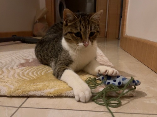 Mahallede bakılıyordu, tanımadığım bir komşu kısırlaştırdı. Yarası enfeksiyon kapmıştı, iyileşene kadar tedavisini yapmak için eve aldım ve gördüm ki tam bir ev kedisi, ayağımın dibinden ayrılmıyor ve hep sırnaşıp kucağıma yatıp sevgi istiyor. Bahçedeki kardeşleriyle arkadaşlarıyla hep iyi anlaşıyor. Alerjimden dolayı daha fazla evde bakamayacağım, sokağa salmamak için ev arıyorum. Bir diz kapağı doğundan oluşmamış ama ne koşmasında ne de zıplamasında bir etkisi görünüyor, çok sağlıklı.