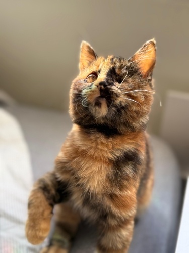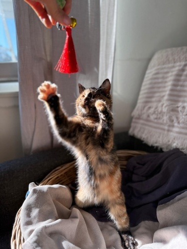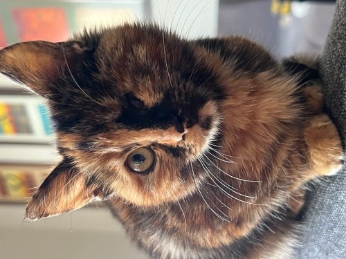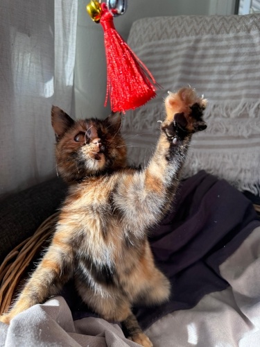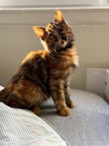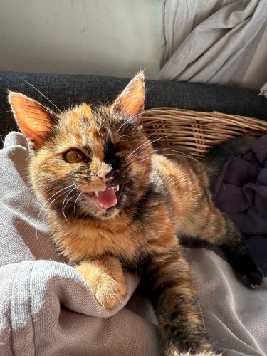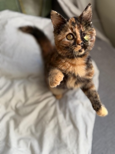 iki buçuk üç aylık kadar var bu dişi yavru. çok sakin ve az hareketli bir kedi. kedim çok oynamasın, koşturmasın diyorsanız ideal. siz oturun o da oturur, yürüyün o da yürür. öyle bir kedi. zaten duvar kenarında oyuncak gibi hareketsiz ve ilgisiz otururken buldum. bu sene çoğu yavruya olduğu gibi o da tek gözünü kaybetmiş. fakat kedilerde tek gözlü olmak pek engel sayılmıyor. normal kedi gibi yaşayıp gidiyorlar. tuvalet terbiyesi var, ilk günden kendi kendine öğrendi hemen. iç ve dış paraziti yapıldı. yuva bulmaya hazır.