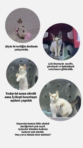 Sokakta hasta bulundu, tedavisi aşıları ve kısırlaştırması yapıldı. Çok sağlıklı ama Akciğerleri zayıf olduğu için sokakta yaşayamaz. Oyuncu ve gurgur kendini sevdirme delisi