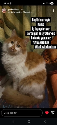 Erkek,Kısır,Kuduz,-iç-dış yapıldı.Çok sakin,sevgi dolu.Dışarda yaşayamayacak kadar ürkek.Kedinize de arkadaş olur.Geçici evde süresi 3 gün sonra bitiyor.Bu tatlı oğlana sıcak yuvanızı açar mısınız.Gözteoe-İST 05356908285