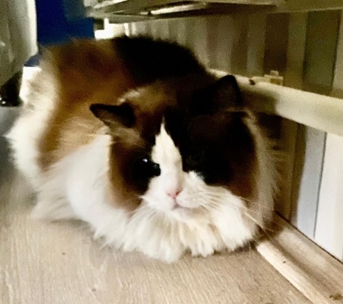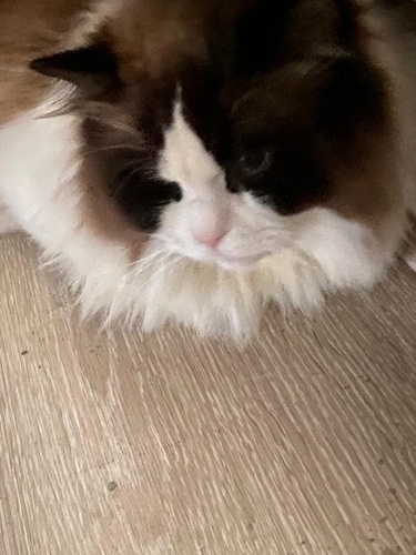 Mavi, 4 yaşında, erkek ve kısırlaştırılmış bir kedi. Ragdoll cinsi, çok güzel, çok insancıl, narin, yumuşak sesiyle kendisini sevdiren bir yapısı var. Ev düzenine uyum sağlayan, eşyalara zarar vermeyen yumuşak huylu. İnsanla arası çok iyi.