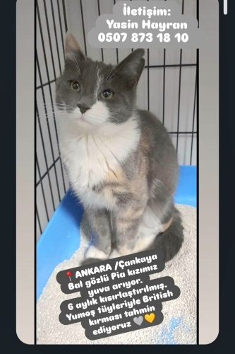 📍ANKARA /Çankaya İletişim Yasin hayran 0507 873 18 10 Bal gözlü Pia kızımız yuva arıyor. 🐾 Tam bir minder kedisi. 6 aylık kısırlaştırıldı, iç dış parazit uygulamaları yapıldı. Yumoş gibi tüyleriyle British kırması olduğunu tahmin ediyoruz. 🩶 Bu soğuklarda sokaklara dönmesin. 🌻