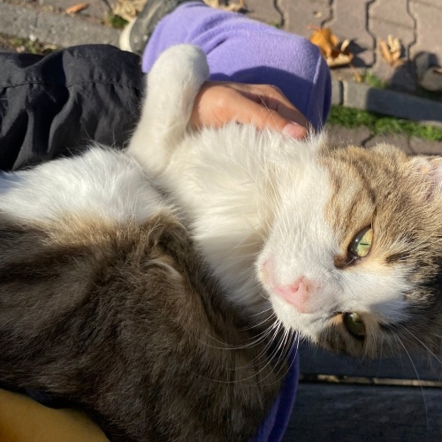 Dünya güzeli, kucak kedisi ama bahtsız bir kız. Veteriner iki yaşında bile olmadığını söyledi. Çok üşüyor, üşüdüğü için kucağa çıkmaya çalışıyor, belki eve alırlar diye gelen gideni takip edip peşlerinden gitmeye çalışıyor. Daha önce doğurmuş ama bebeklerine bakamamış. Şimdilik kısırlaştırıldığı klinikte, ama birkaç günü var. Takip, cam ve balkonlarda güvenlik şartıyla, maddi manevi ihtiyaçlarını karşılayabilecek, düzeni oturmuş, küçük çocuğu olmayan bir yuva arıyoruz kendisine.
