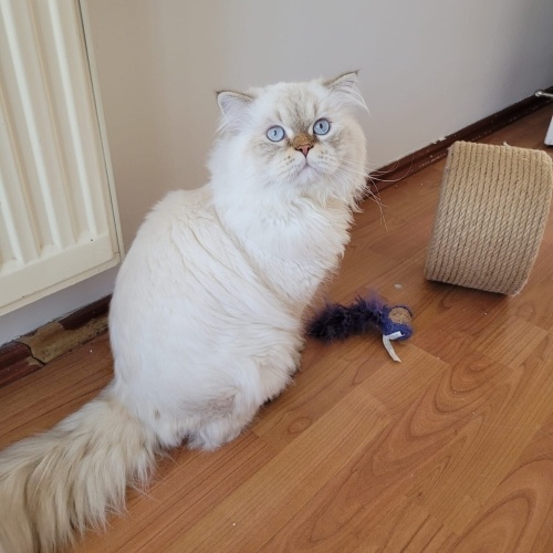 Sokakta bulundu. Ben geçici yuva oldum. Kedi şuan İzmir'de. Lynx Point krem rengi, buz mavisi gözlü, erkek, veterinerin tahminine göre 2.5 - 3 yaşlarında british - persian olabileceğini söyledi. Tüyleri britishe göre çok daha yumuşak ve ipeksi. Kısırlaştı ve üriner mama ile beslenmesi gerekiyor. Çok hareketli, oyuncu, cana yakın, sosyal bir kedi. Kucak sever, size sürtünür hatta yalar. Evdeki kedim onunla anlaşamadığı için yuva arayışına başlamayı uygun gördüm. Ücretsiz, takip şartlı sahiplendirilecektir. Hareketli olduğu için onu oynatabilecek, enerjisini atmasını sağlayacak. Maddi ve manevi olarak layıkı ile bakabilecek. Uzun tüylü kedi bakımından anlayan, camlarında ve balkonunda sineklik ve filesi olan. Canı bana emanet olan bu cana, canı gibi bakacak birine sahiplendirilecektir.