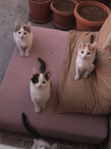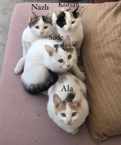 Hepsini parkta koliye bantlı şekilde yeni doğmuş halde bulduk. Yaşama şansları olsun diye annem baktı ancak iki köpeğimiz var ve biri kedilere karşı saldirgan. Kedileri mecburen sahiplendirme ki zorundayiz yoksa sokağa gidecekler. Çok tatlı yavrular. Sade erkek kalanları dişi