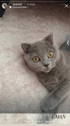 1 yaşında tüm aşıları tamam bir british shortheir cinsi erkek kedime dumanımı il dışına çıkacağımdan ilgilenecek kimse olmadığından dolayı sahiplendirilecektir gayet uysal sağlıklı tatlı bir erkek kedi mama kabı porselen ve Demir su kanı porselen ve Demir ve standı tarak buharlı tarak evi 2 taklı tırmalamalı maması pro plan marka analayan bilir kaliteli bir markadır tualeti küreği Demir tuvalet onu paspası elbisesi tut toplama eldiveni vitamini mide için sindirim maltı ve sayamadığım aklıma gelmeyen birçok eşyası ile verilecektir detaylı bilgi için arayın