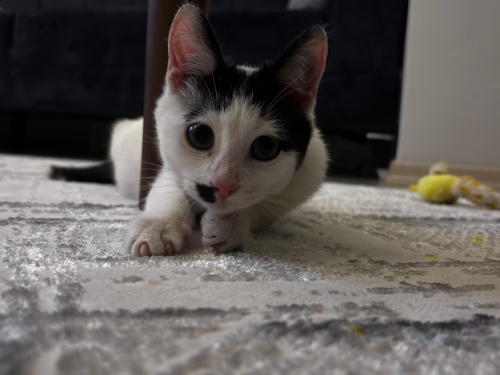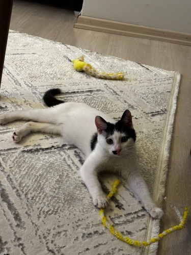 Kedinin Bilgileri: • İsim: Mira • Cinsiyet: Dişi • Yaş: Yaklaşık 3 – 3,5 aylık • Kısır Durumu: Yaşı küçük, henüz kısır değil • Sağlık Durumu: Genel durumu iyi • Aşı Durumu: 31 Aralık tarihinde iç & dış parazit aşıları yapıldı • Tuvalet Alışkanlığı: Var • Karakter: Uysal, oyun bağımlısı insanla teması seven, ev ortamına uyumlu