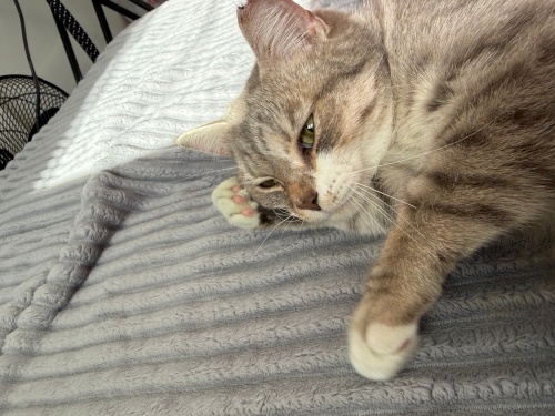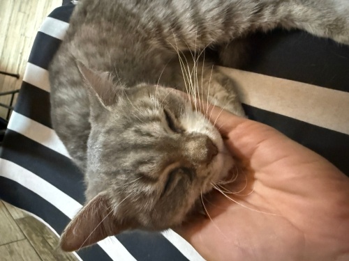 Beş altı ay önce evden atılmış atıldığı evin altındaki marketin önünde aylarca annesini beklemiş her geldiğinde ayaklarına dolanmış ama kadının umrunda değilmiş, hikayesini dinleyince alıp evime getirdim kısırlaştırdım iç dış parazitini yaptırdım fipi lösemisi yok çok sağlıklı bir dişi kedi, dokunduğunuz an gırlayıp kendini sevdirmek için deli oluyor ama sokakta çok korktuğu için evdeki başka kedilerle anlaşamıyor