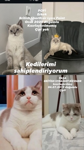 Merhaba ıkıtane british kedisi var arkadaşımın biri paşa 2020 doğumlu erkek kısır çipli. Pofi erkek 2024 doğumlu çipsiz kısır değil çocuğumun alerjisi oldugu için sahiplendirmem gerekiyor lütfen bu numara ile iletişime geçiniz 0505 8320407