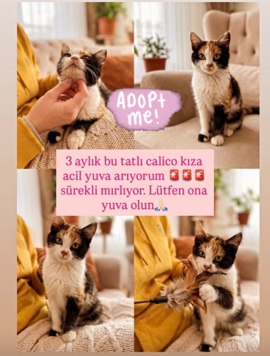 Bal kış günü yol ortasında ezilmekten son anda kurtarıldı. Herkesin peşine takılıp kendini sevdirmeye çalışıyordu. Yaklaşık üç aylık çok sevecen sürekli mırlayan bir kız. Acil yuva arıyor. Hayvan bakmanın sorumluluğunu bilen, ömürlük evini açacak bir yuva arıyorum. Kuru mama yiyor, kum kullanmayı biliyor. Onun şansı siz olun.